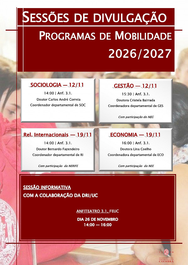 Durante o mês de novembro decorrem na Faculdade de Economia da Universidade de Coimbra, sessões de divulgação dos programas de mobilidade 2026/27 abertas a todos os estudantes que desejem realizar uma mobilidade.